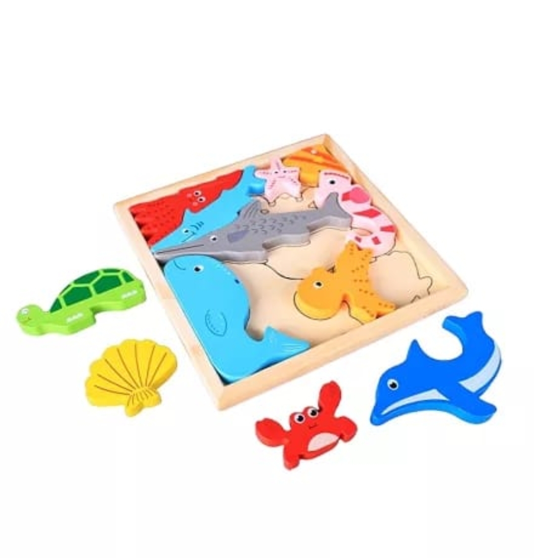 The Sea Animal Tray Wooden Puzzle helps children explore the underwater world while improving observation and memory. Each wooden piece fits neatly into a tray, making it easy for toddlers to use. A perfect educational toy for kids fascinated by marine life.